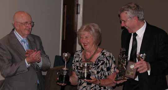 09. Patricia helps Phil hold his clutch of trophies - Bournes Cup, Ward Trophy, Fiction Trophy and Points Award Cup