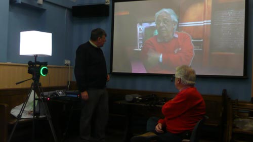 Roger demonstrating the composite image of Laurie and a stock background produced using his 'green' screen equipment